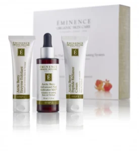 Upplev kraften i Eminence Organics Arctic Berry Peel & Peptide Illuminating System – en avancerad men naturlig peelingbehandling som kombinerar resultatet från en kemisk peeling med tryggheten i ekologiska, näringsrika ingredienser.